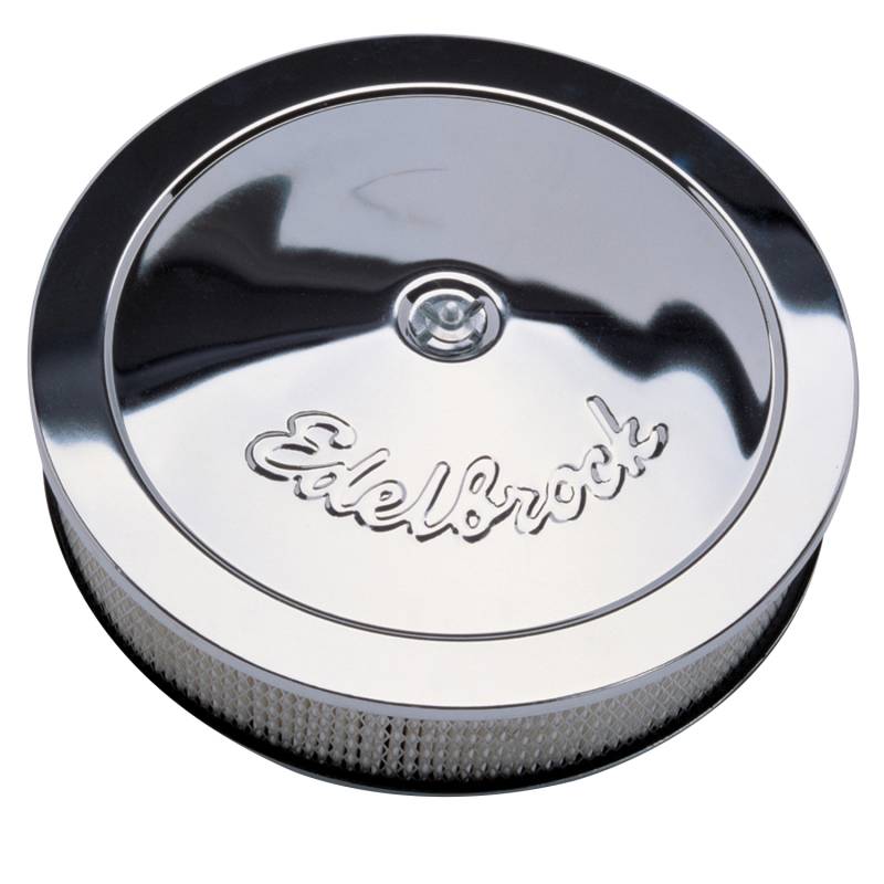 Edelbrock triple chrome-plated round air cleaner #1207 works with all popular 5-1/8" diameter carburetors (AVS2, Performer Series, Thunder Series AVS, Holley, Thermo-Quad, Quadra jet and Carter AFB). The 10" and 14" models have knock-outs in the air cleaner base for use with Edelbrock crank case ventilation adapter #1205 (sold separately). #1208, #1209 and #1221 fit all Edelbrock carburetors. Heights of air cleaners are in parentheses, measured from the gasket flange to the top of the supplied retaining nut. Dimensions are accurate within 1/8".