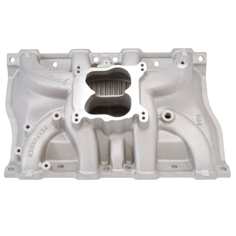 Performer Intake Manifold for 1968-1976 Cadillac 472-500, Satin Finish Edelbrock part #2115 Performer Cadillac intake manifold is designed for 1968-76 Cadillac 472 and 500 cubic-inch engines. For either square or spread-bore carbs, this is the first intake designed specifically for high-performance Cadillacs using standard heads. Like all Edelbrock Performers, this manifold increases torque and horsepower from idle to 5500 rpm. The broad power band is ideal for high-performance's street and engine swap applications. Specs on this non-EGR manifold include a carb pad height that's 3" taller than stock. Dropped divider wall evens air/fuel ratio throughout the rpm range. Stock air conditioning compressor will not fit.