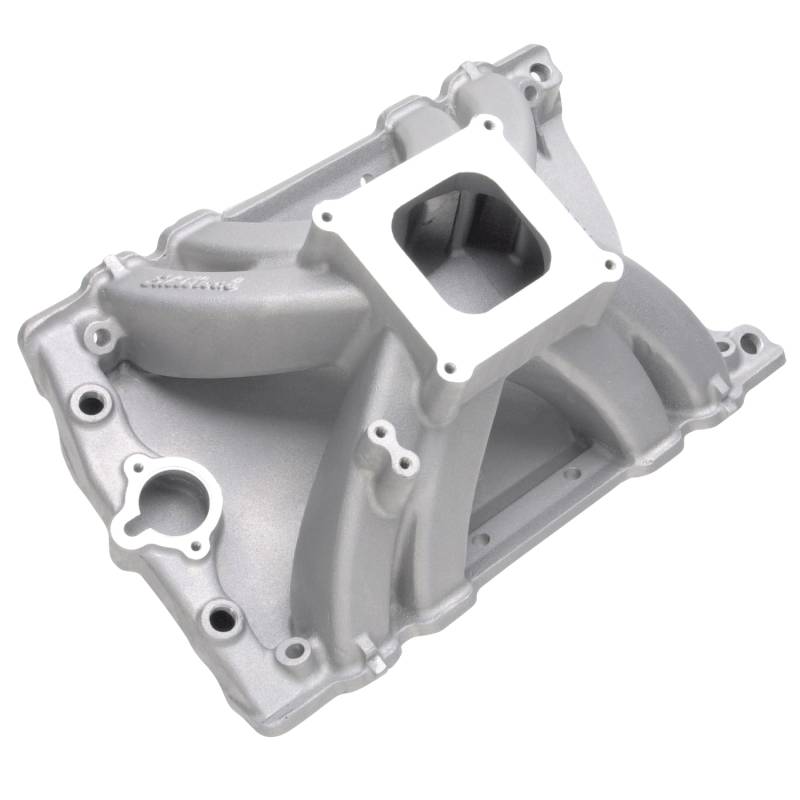 Victor Olds 455 Intake Manifold for 455 Oldsmobile Engines Edelbrock part #2810 Victor Oldsmobile 455 drag racing intake manifold provide power levels never before available for competition single-carb 455 Olds engines. In independent flow testing, our port-matched design out-flowed the best fully ported manifolds on the market. Featuring a single-plane "Air-Gap" design, they are available for square-bore or 4500 Series carbs to accommodate many competition applications, and offer significant horsepower increases over existing intakes in the 4500 to 7500 rpm range. With a carb mount pad height of 8.2", this manifold stand more than three inches taller than the Edelbrock Torker manifold and incorporate a high-flow 3.4-square-inch runner. We've removed the intake bolts between the runners, thus creating a smoother airflow path for higher airflow and more power! This intake manifold features a port size and shape that has been optimized to match the flow characteristics of Edelbrock Performer RPM #60519 aluminum cylinder heads.