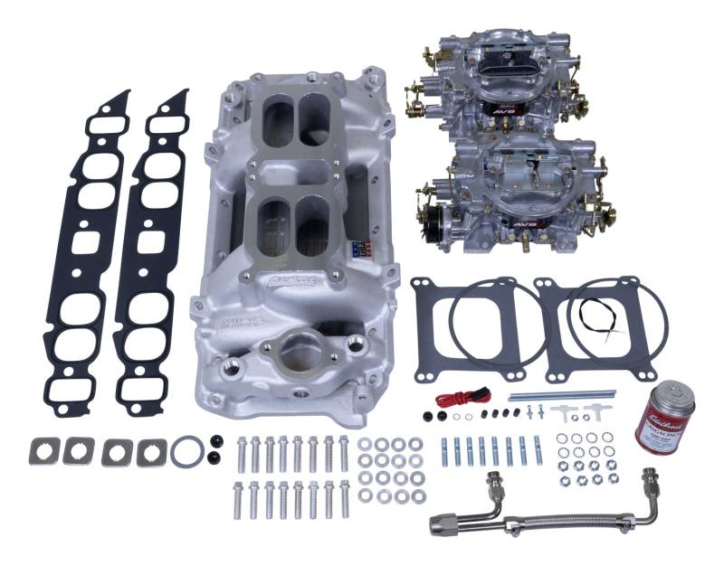 Manifold & Carb Kit The Edelbrock #2065 RPM Dual-Quad manifold and carb kit is designed for Big-Block Chevy Oval-Port applications. A huge hit among street rodders, this Dual-Quad Kits offer the ultimate set-up for anyone who wants the look and the performance of dual-quad carbs. The Edelbrock #2065 includes an Edelbrock RPM or RPM Air-Gap Dual-Quad intake manifold and two 500 cfm Thunder Series AVS carburetors calibrated specifically for dual-quad applications (one manual choke, one electric choke). To make the installation simple, these kits also include our high-tech progressive throttle linkage, Russell fuel inlet, high-quality Edelbrock intake gaskets, intake bolt set and carburetor stud kit. The manifold and Thunder Series carbs are available with a standard satin finish or with our bright EnduraShine chrome-like finish for long lasting show quality looks.