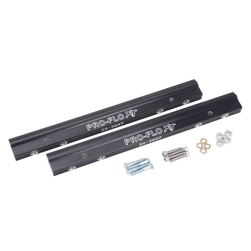 Fuel Rail Kit for Big-Block Chevy -6 AN in Black Finish All Edelbrock fuel rails are machined from high quality extruded aluminum. Each kit includes fuel rails, stands and mounting hardware. Fuel fittings, crossover line and regulator not included. 3658 Big-Block Chevy fuel rail kit is for use with Pro-Flo XT Manifold #7136. Rails will have a Black Anodized Finish and -8 AN inlet/outlets.