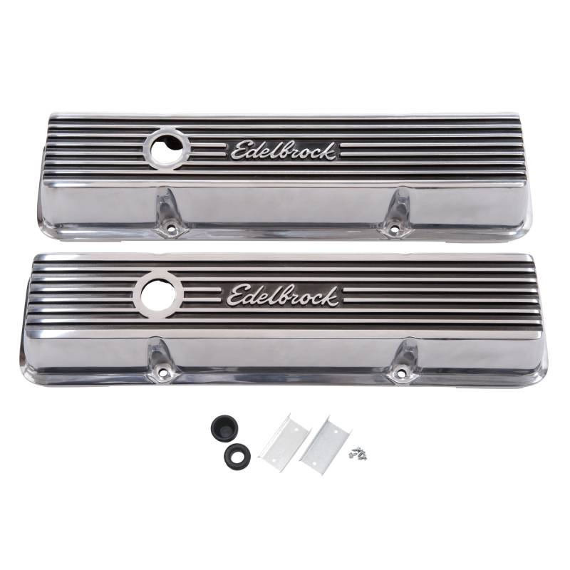 The Edelbrock #4263 Elite II Valve Covers are designed for Chevy 262-400 V8 1959-86 applications. This new line of Elite II valve covers feature a design that is influenced by the original Elite Series originally released in 1985, but with a new modern take on this classic look. They're made from heavy-gauge, die-cast aluminum and are finished off with a show quality high luster polished finish. The raised fins are accented by a contrast gloss black finish between the fins for the definitive Elite Series look. Our tall profile valve covers are 2" taller than stock, and clear most roller rockers and valvetrain components. Our low profile valve covers clear all air-conditioning, alternator brackets and aluminum rockers. Overall height is measured from gasket flange to top at the highest point.