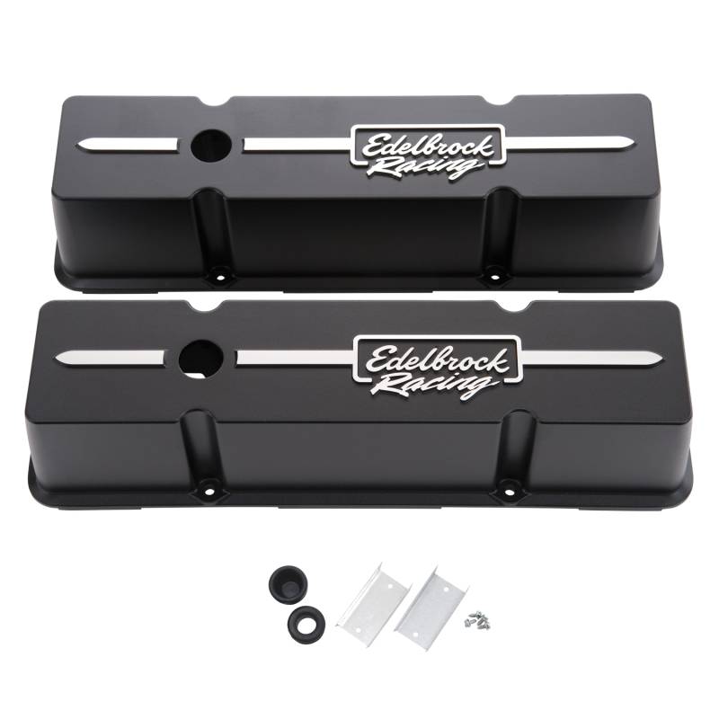 Edelbrock part #41643 Racing Series valve covers are designed for Chevy 262-400 V8 1959-86 applications. Our new Racing Series accessories are the latest addition to our line of engine dress-up accessories. Made from heavy-gauge, die-cast aluminum, these valve covers feature a sleek flat black textured finish with diamond cut finish raised racing stripe and Edelbrock Racing logo. The modern high-tech look will give any engine an aggressive look to match it's performance. Our Tall Profile are 2" taller than stock, and clear most roller rockers and valvetrain components. Our Low Profile valve covers clear all air-conditioning, alternator brackets and aluminum rockers. Overall height is measured from gasket flange to top at the highest point.