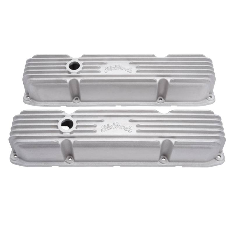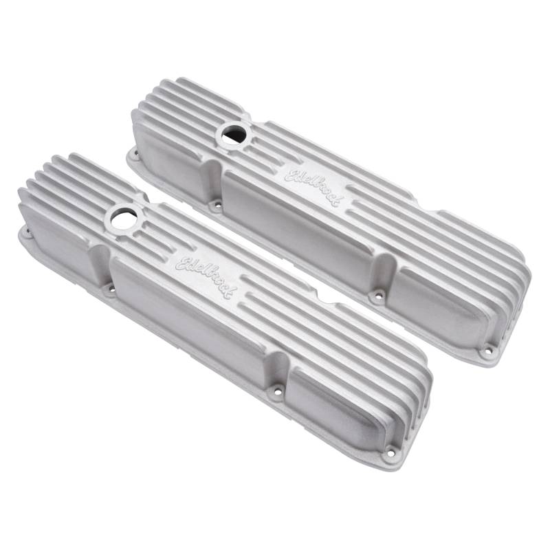 Edelbrock part #41929 Classic Series Valve Covers are designed for Chrysler Big-Block 383/440 applications and have a Satin finish. Edelbrock first made these aluminum valve covers in the late '50s and they're still a classic. Made of heavy-gauge sand-cast aluminum, Overall height is measured from base to top at the highest point. Edelbrock classic valve covers can be machined to accept breathers if desired.