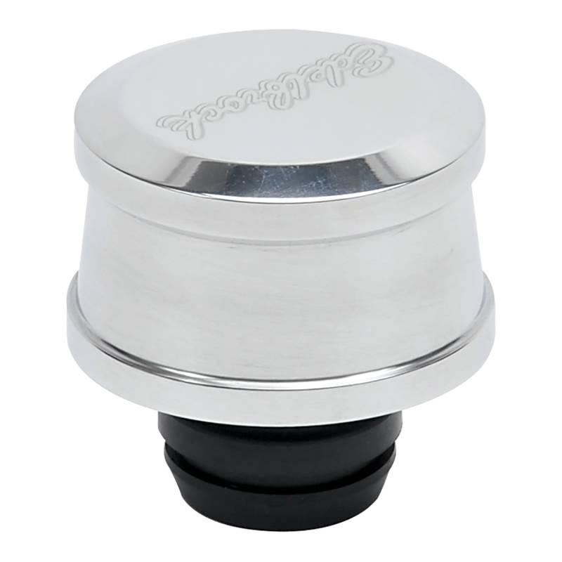 Push-in Round Billet Aluminum Breather - Polished Edelbrock part #4213 Billet Polished Aluminum push in Breather fits all standard 1.25" valve cover holes. The top of the breather un-screws from the base for access to the foam insert. Breather is round and is 2.480" at the base and 2.350" at the top. Overall height of the breather is 1.750".