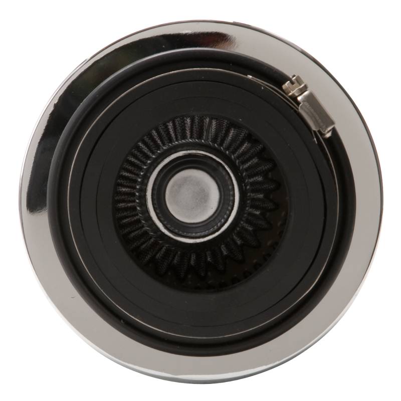 Pro-Flo Universal Black Compact Conical Air Filter with 3", 3.5", and 4" Inlet Edelbrock Universal Pro-Flo Conical Air Filter #43610 is an economical way to ensure your engine is getting clean air, without the expense of buying a new filter every few thousand miles. Its constructed for superior filtration and air flow performance. Features triple chrome plated trim for a show-quality look. Universal Fit Series is also designed with three inlet adapter rings for use on 3", 3.5" and 4" inlet tube systems. It also feature the Edelbrock exclusive Pro-Charge clean strip for easy maintenance. The Pro-Charge strip will let you know when it's time to clean your filter. Rated for use engines making less than 340 horsepower. Each filter comes pre-oiled and is washable and reusable. Use Edelbrock Pro-Charge Cleaning Kit #43600 to clean and re-oil.