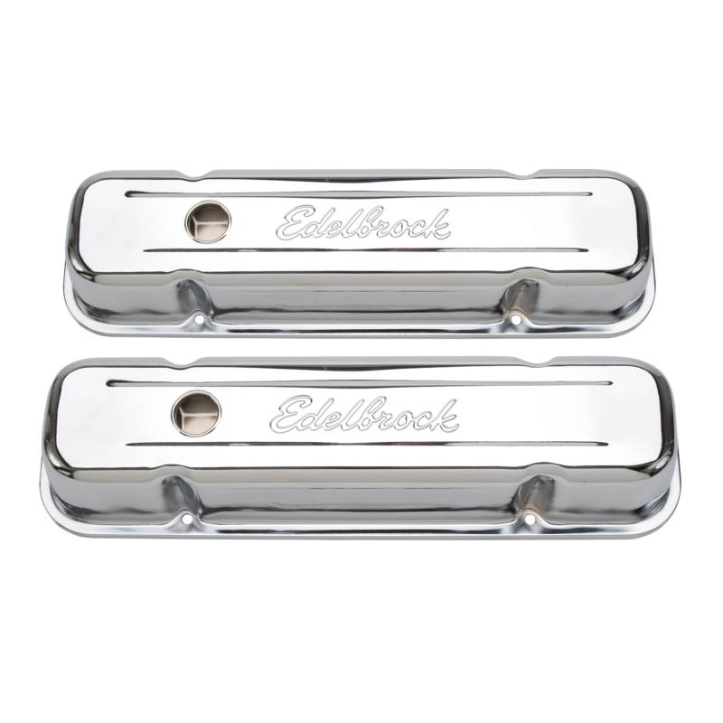 Signature Series Valve Covers, Chrome, Tall Profile, Pontiac 301-455 V8, '62-'79 The Edelbrock #4457 Signature Series Valve Covers are designed for Pontiac 301-326-350-389-400-421-455 V8 - '62-79 applications. Engineered for function and styled for great looks, Signature Series valve covers have stock-style breather baffles that prevent oil passage to the PCV valve. These quality valve covers accept all emissions equipment, including PCV valve holes. Rubber grommets for the breather and PCV valve holes are included. Matching breathers sold separately.