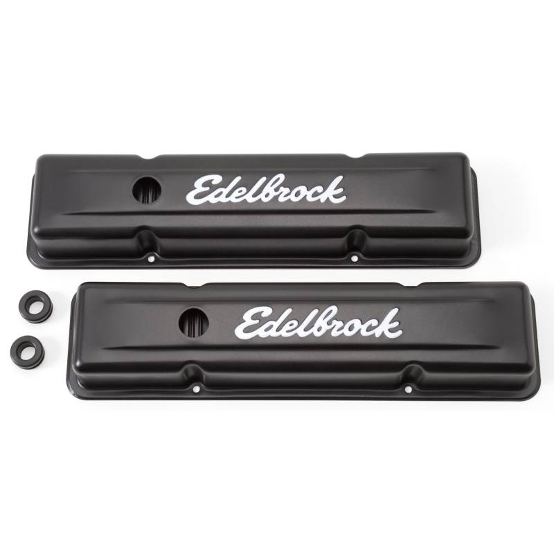 Signature Series Valve Covers, Black, Low Profile, Chevrolet 262-400, '59-'86 The Edelbrock #4443 Signature Series Valve Covers are designed for Chevrolet 262-400 '59-86 applications. Engineered for function and styled for great looks, Signature Series valve covers have stock-style breather baffles that prevent oil passage to the PCV valve. These quality valve covers accept all emissions equipment, including PCV valve holes. Rubber grommets for the breather and PCV valve holes are included. Matching breathers sold separately.