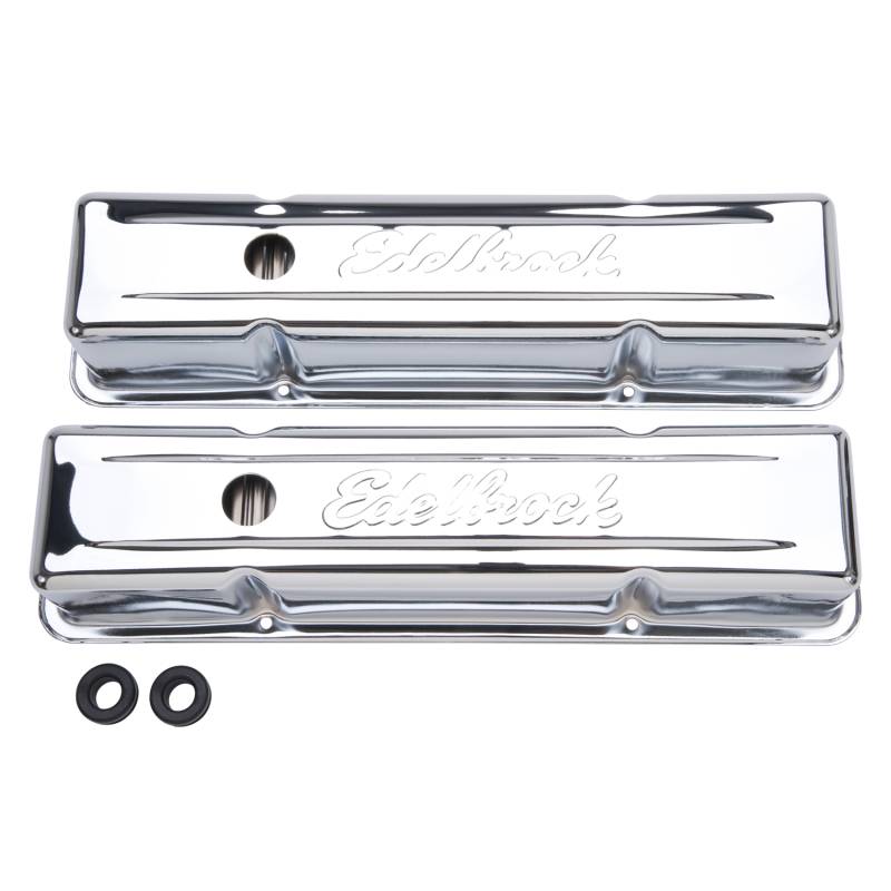The Edelbrock #4649 Signature Series Valve Covers are designed for Chevrolet 262-400 '59-86 applications. Engineered for function and styled for great looks, Signature Series valve covers have stock-style breather baffles that prevent oil passage to the PCV valve. These quality valve covers accept all emissions equipment, including PCV valve holes. Rubber grommets for the breather and PCV valve holes are included. Matching breathers sold separately.