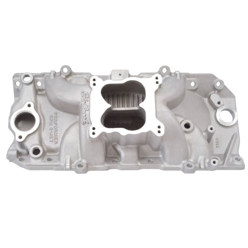 Performer RPM Big Block Chevy Oval Port Q-Jet Intake Manifold Edelbrock part #7164 Performer RPM Q-Jet intake manifold is designed for street 396-502 c.i.d. Chevy V8's with large oval-port (1975 and earlier) heads. This intake manifold is designed works with spread-bore carbs, but also works with Edelbrock square-bore carbs without adapter. No provisions for hot air style chokes. Accepts divorced choke, late-model waterneck, air-conditioning, alternator and HEI equipment.