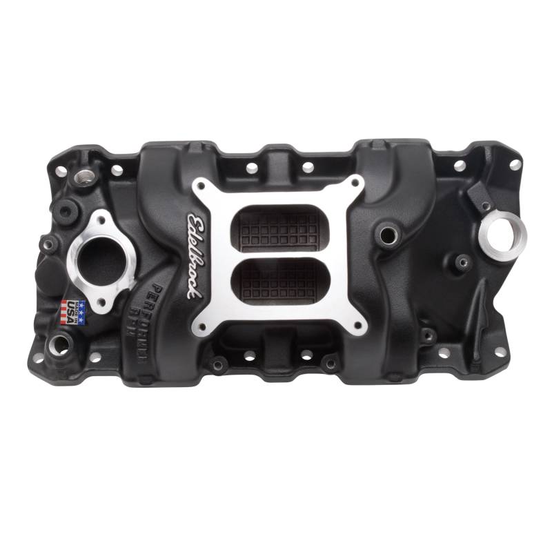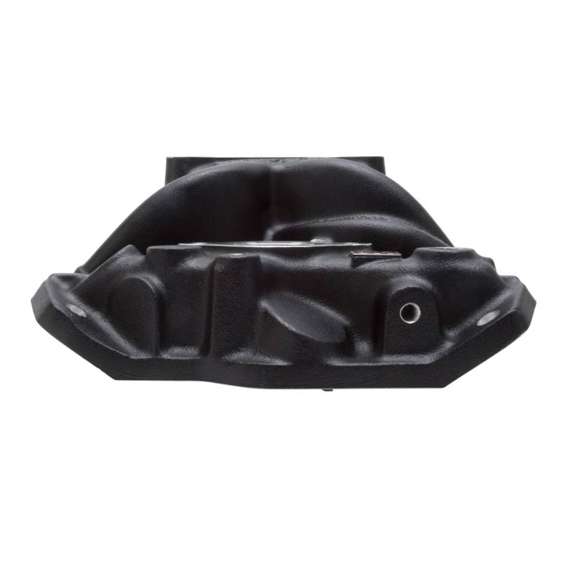 Performer RPM Small Block Chevy Black Intake Manifold Edelbrock part #71013 Performer RPM intake manifold is designed for 1955-86 262-400 c.i.d. Chevy V8's, for maximum power and a broad torque curve for high-performance street/marine engines. Provides power like a single-plane and throttle response like a dual-plane. Has provisions to machine for an oil fill tube. No provisions for exhaust heated or stock-style choke. Accepts late-model water neck, air-conditioning, alternator and H.E.I. Will fit cast iron Chevrolet Bowtie heads but will not fit 1987 and later cast iron heads. Intake manifolds will not fit under stock Corvette hood. This manifold offers a durable black power coated finish for long lasting protection and a distinctive look.
