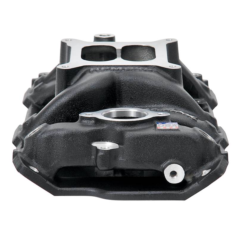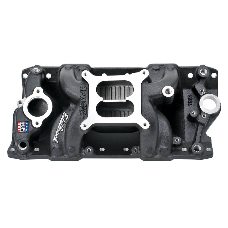 Performer RPM AIR-Gap Small Block Chevy Black Intake Manifold Edelbrock part #75013 RPM Air-Gap RPM intake manifold is designed for 1955-86 262-400 c.i.d. Chevrolet V8's. The award-winning RPM Air-Gap intake manifold incorporates the same race-winning technology that's used on our Victor Series competition intakes. The air-gap design features an open air space that separates the runners from the hot engine oil resulting in a cooler, denser charge for more power. Edelbrock's Performer RPM gives you the ultimate in street high-performance. Accepts all 1976 and later alternator and A/C brackets for the street. No provision for exhaust- heated chokes and no exhaust crossover. Not for 1987 and later cast iron heads and will not fit under stock Corvette hood. This manifold offers a durable black power coated finish for long lasting protection and a distinctive look.