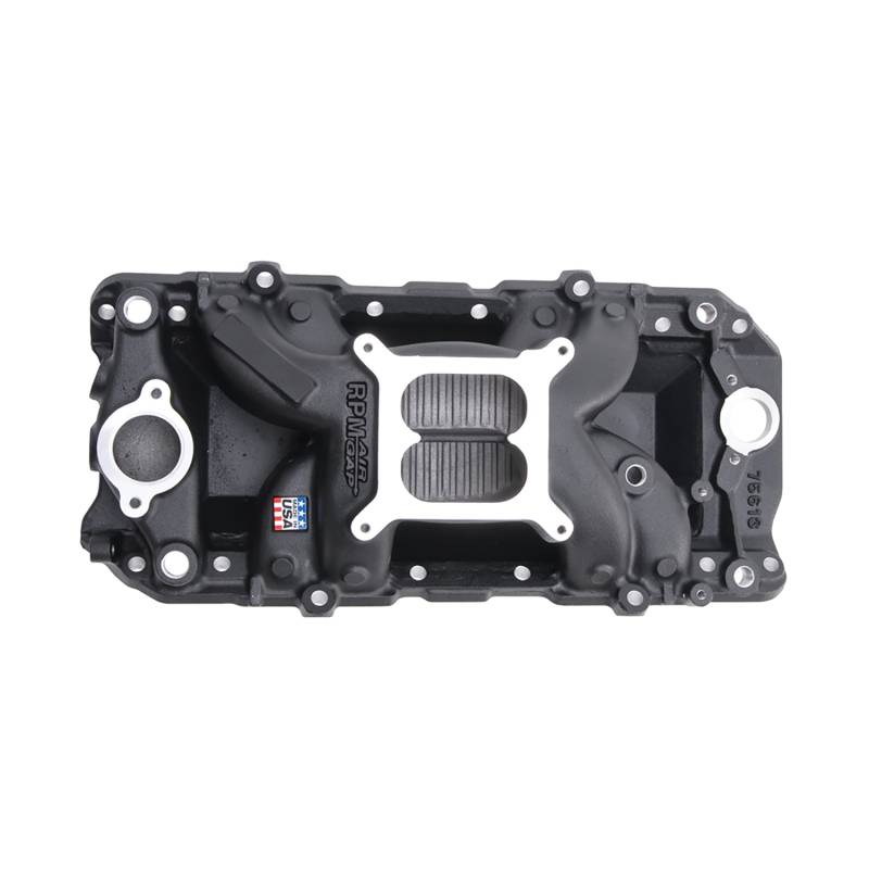 RPM Air-Gap Big Block Chevy 2-O Black Intake Manifold Edelbrock part #75613 RPM Air-Gap 2-O intake manifold is designed for street 396-502 c.i.d. Chevy V8's with large oval-port cylinder heads (1975 and earlier) or Edelbrock Performer/Performer RPM heads. The RPM Air-Gap incorporates the same race-winning technology that's been used on our Victor Series competition intakes for decades. The Air-Gap design features an open air space that separates the runners from the hot engine oil resulting in a cooler, denser charge for more power. Includes rear water outlets, two distributor clamp locations and nitrous bosses. Accepts all late model alternator and A/C brackets for the street. For square bore carburetors only. Will not fit under stock hood of Corvette, 1964-67 Chevelle or 1967-81 Camaro. No provision for exhaust heated chokes and no exhaust crossover. This manifold offers a durable black power coated finish for long lasting protection and a distinctive look.