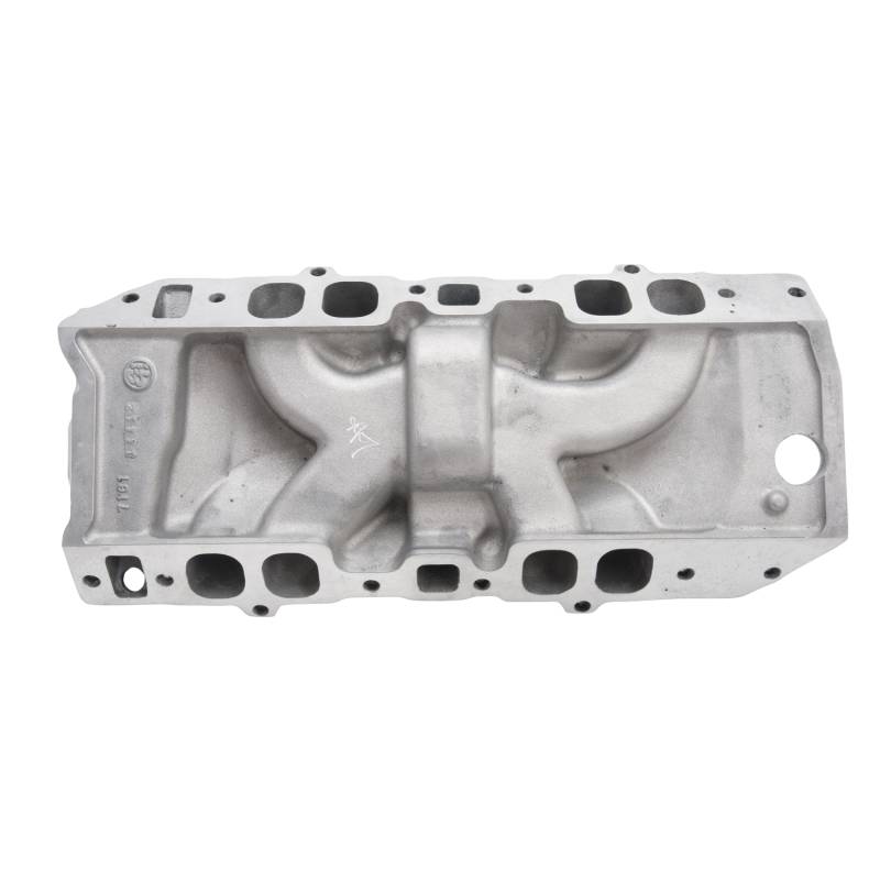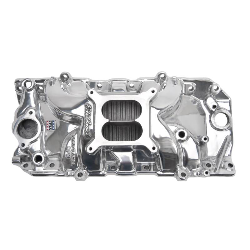 RPM Air-Gap Big Block Chevy 2-O Polished Intake Manifold Edelbrock part #75611 RPM Air-Gap 2-O intake manifold is designed for street 396-502 c.i.d. Chevy V8's with large oval-port cylinder heads (1975 and earlier) or Edelbrock Performer/Performer RPM heads. The RPM Air-Gap incorporates the same race-winning technology that's been used on our Victor Series competition intakes for decades. The Air-Gap design features an open air space that separates the runners from the hot engine oil resulting in a cooler, denser charge for more power. Includes rear water outlets, two distributor clamp locations and nitrous bosses. Accepts all late model alternator and A/C brackets for the street. For square bore carburetors only. Will not fit under stock hood of Corvette, 1964-67 Chevelle or 1967-81 Camaro. No provision for exhaust heated chokes and no exhaust crossover. This manifold offers a polished finish for a brilliant shine and classic look.