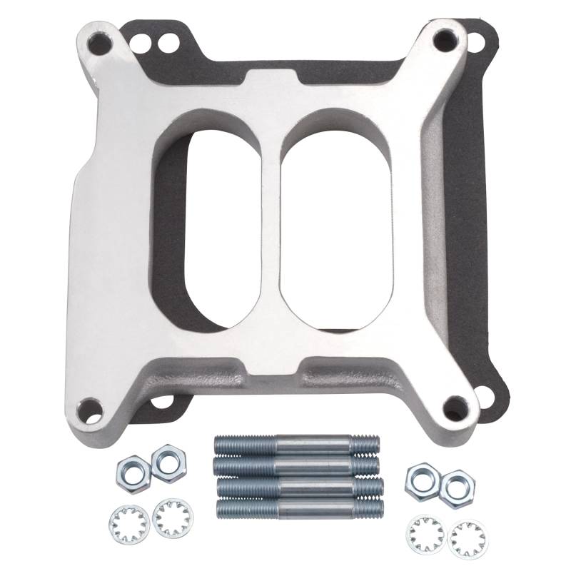 The Edelbrock Carburetor Spacer #8714 divided design is for use with Dual-Plane Design intake manifolds. The Edelbrock #8714 divided spacer is 1" thick and made of aluminum.