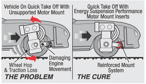 Polyurethane Motor Mount Insert Available for many popular sporty and performance front wheel drive vehicles. A real must to use for sport compact competition and performance uses. Helps reduce wheel hop and traction loss. Prevents damage to other vehicle components. Improves and even restores broken motor mounts. Made of Hyper-Flex(TM) performance polyurethane. Resistant to under vehicle fluid oils, coolants and road contaminants. Prevents Tearing Of Original Soft Mount Material A Must-Use For High Performance Conditions Eliminates Excess Engine Movement