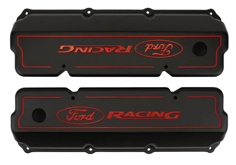 Cleveland Black Aluminum Valve Cover What's a high performance Ford without a set of Ford Racing valve covers? Take your pick from die-cast aluminum covers with a smooth or finned design in either a polished or satin black finish. The valve covers are available in a variety of styles with an array of logos that are sure to add an individual touch to your Ford. Die Cast Aluminum With Baffle Satin Finish Ford Racing Logo Accent In Red Will Clear Stud Girdle And Roller Rocker Arms Incl. Oil Fill Cap/Grommets