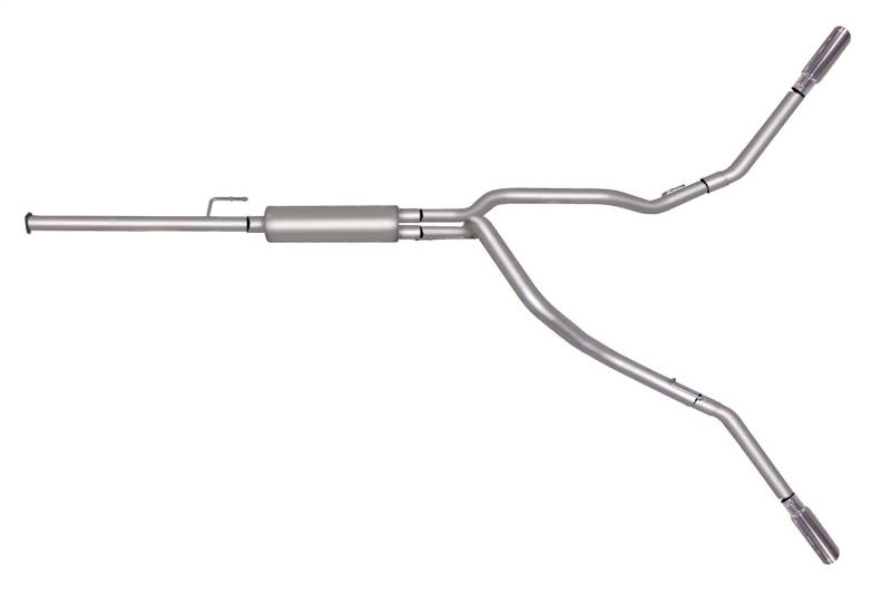 Dual Extreme Exhaust System For the extremist who wants to take their truck to the next level, this dual bolt-on Cat back system is for you. This system exists behind the rear tires at an aggressive angle with a powerful exhaust tone. You will gain bold street looks with powerful dyno tuned and tested street performance gains. You can expect to experience gains on average of 15-20 horsepower. Gibson muffler provides a mean performance sound and complemented with polished Stainless Tip. Easy bolt-on installation. No welding required. Backed by a Lifetime Limited Warranty. If you want Extreme, this system is it. Stainless Steel Mandrel Bent Tubing Superflow™ CFT Muffler Baffled/Chambered Muffler; No Internal Packing Minimal Interior Drone - Aggressive Sound Polished Stainless Slash-Cut Clamp On Tips