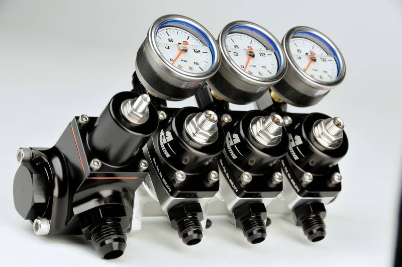 Aeromotive’s new Modular / Stackable Carbureted Fuel Pressure Regulators (P/N 13217). Ideal for carbureted nitrous engines, these regulators allow you to stack them together to control multiple pressures with a single fuel pump. The new Stackable Regulator is a clean, lightweight solution, ideal for nitrous engine combinations where unique pressures are desired.\nCapable of feeding single or dual carburetors and 1, 2, 3 and 4 or more stages of nitrous, all with total control of unique fuel pressures at every distribution point. For the ultimate nitrous fuel system, it's easy to combine Aeromotive's Pro-Stock 2 or 4-port regulators with the new Stackable Regulators, where all flow and pressure control is consolidated for a much cleaner, lighter package. Screw the combined Stackable Regulators to the inlet of an Aeromotive dead-head Carbureted Fuel Pressure Regulator, and control your carburetor system pressure separate from each stage of nitrous.\nCombine the Stackable regulators with conventional carbureted fuel pumps like the Aeromotive A2000 or A3000, or combine with our inline pumps including the A1000, Eliminator and Pro-Series Pump, or the Brushless 3.5 and 5.0. In-line EFI style pumps require the A3000 bypass regulator with return line, P/N 11217 to set and maintain line pressure. For more information about a system for your application call our tech lines.