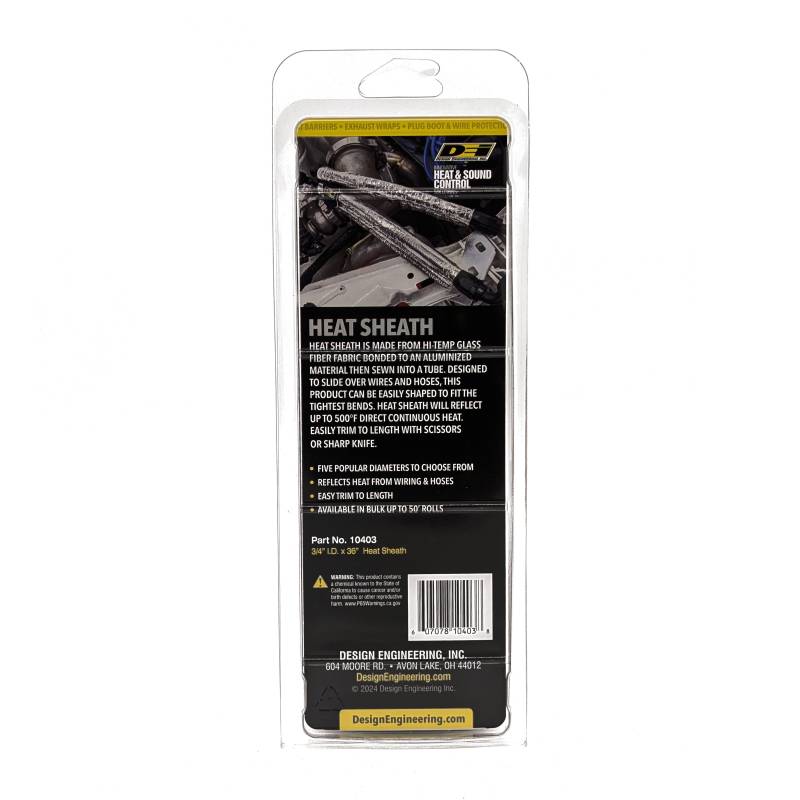 Heat Sheath .75in x 36in Heat Sheath solves the problem of heat and abrasions causing failure of lines, hoses & wires. Designed to slide over wires, cables and hoses, Heat Sheath provides the ultimate protection from extreme heat as well as chemical and oil spills, dirt, grease and road grime. Constructed from a high temperature fabric and bonded to an aluminized material to reflect heat. Heat Sheath is fireproof and wit'stands direct heat up to 500F. Pliable for tight bends Capable of wit'standing 2000F radiant heat Trim to desired length NOTE: Each diameter is available up to 50 ft lengths. Other diameters are also available as a special order. Items with custom cut patterns andDO NOT apply directly to exhaust components. Capable Of Wit'standing 500 Degrees F Direct/2000 Degrees F Radiant Heat Pliable For Tight Bends Trim To Desired Length
