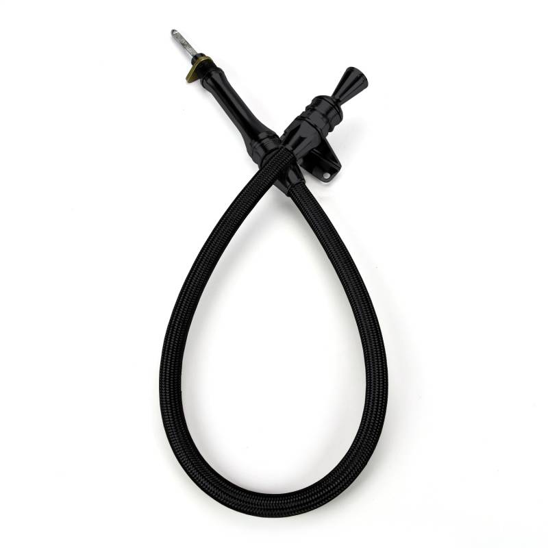 No filter tube needed. The locking mechanism eliminates expulsion of the dipstick handle under trans pressure. Bolted in sealed pan fitting. Large filter tube accepts standard transmission funnels. Made from 6061 aluminum and features Teflon lined stainless braided outer housing. Flexible inner dipstick measuring cable. No pan fitting leaks during storage. Dipsticks are available with firewall mount or transmount mounting bracket. The transmission and firewall mounts are supplied with transmission storage plug for quick change and storage. Spare transmission fittings are available for quick transmission changes. Available for most GM, Ford and Chrysler transmissions. Available in brite or black.