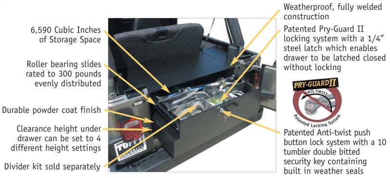 Drawer | Cargo Security | Jeep Wrangler TJ/LJ | 1997-2006 This heavy duty, high security, 16 gauge steel drawer mounts behind the rear seat in a Jeep Unlimited LJ. The large drawer slides on heavy duty stainless steel roller bearings and can be securely locked to provide protection for equipment and other valuables. The drawer can be mounted at four different available heights with a maximum clearance of 4 inches underneath which creates an ideal spot to store more items. An optional divider kit is available for this drawer but must be ordered separately (Part number 133-07).