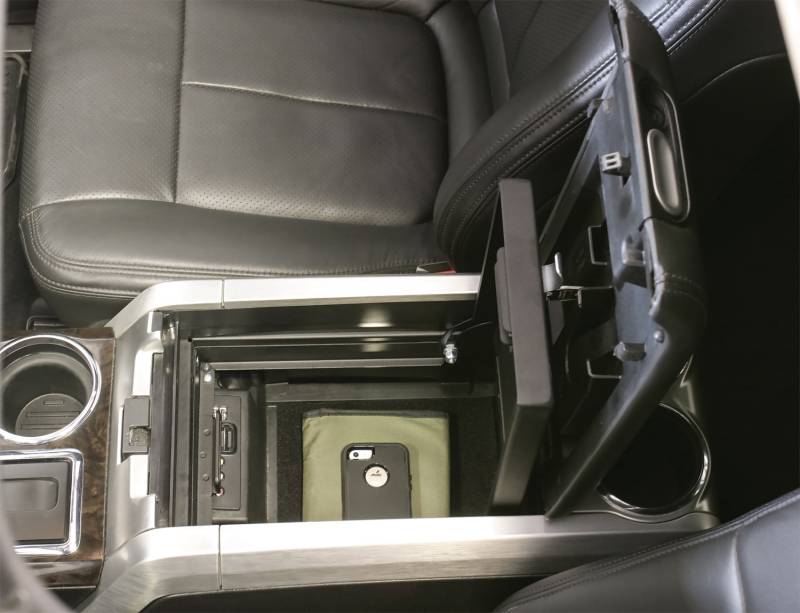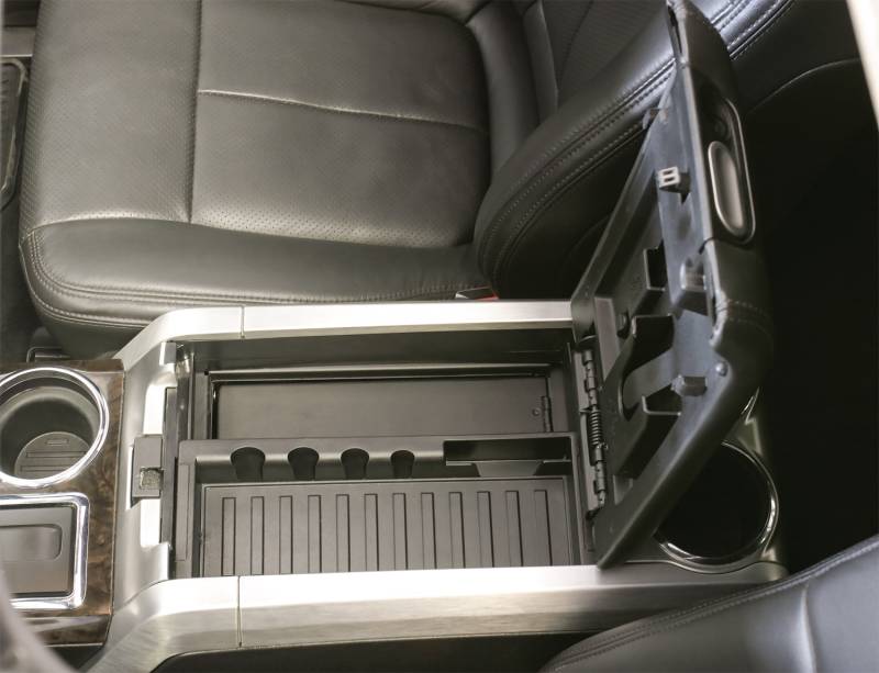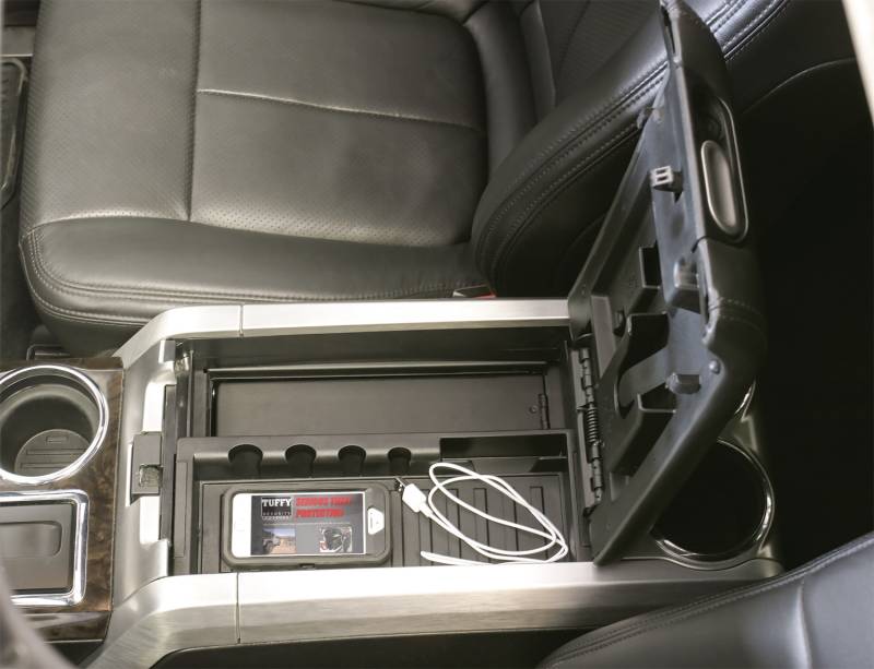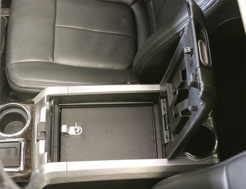 Console Safe | Ford F-150 | Standard Key | 2009-2014 Continuing the Tuffy legacy of designing and manufacturing the finest console safes in the industry since 1997, Tuffy is proud to introduce our new line-up of console safes for full size trucks beginning with the Ford F-150 flow-through center console safe. It maintains a completely stock look including full use of the factory accessory tray, armrest and lid. Featuring a durable texture powder coat finish, the safe comes ready to install in just a few minutes without drilling.
