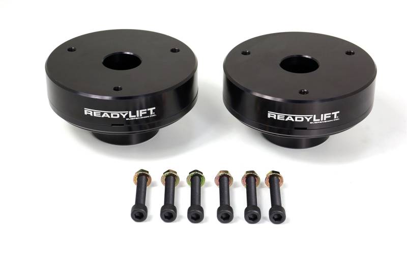 Level your truck with style, fit and function for larger tires and wheels. ReadyLIFT T6 Billet Suspension leveling kits are made in the USA using only premium 6061 T6 aircraft billet aluminum and includes 10.9 rated mounting hardware and associated kit parts to get the leveling lift job done right with super cool looks! ReadyLIFT leveling kits are direct bolt-on applications maintaining the factory ride and factory alignment specifications. No cutting or drilling is required when installing our new T6 Billet kits. The ReadyLIFT line of stylish leveling kits are now available in a tough anodized black, silver, blue and red finish and are laser etched with our ReadyLIFT Suspension logo. The T6 Billet line is the ultimate in looks and leveling functionality! Our development team precisely engineers proprietary features into all ReadyLIFT leveling kits to insure the right leveling kit and advertised lift amount for each application. T6 Billet offers truck and SUV owners the option to leveling their vehicles with a custom appearance.