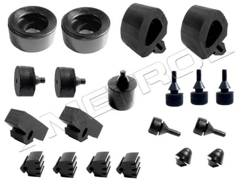Founded in 1918, Metro Moulded Parts, Inc. is the leading USA manufacturer of top quality molded detail rubber parts and sponge rubber weatherstripping for antique, classic, restoration cars and trucks, as well as late model vehicles. Metro's detailed rubber parts are manufactured to meet or exceed the specifications of the original part. They are the finest reproductions available anywhere. Snap-In-Bumper Kit. 20-Piece Set Includes: (4)DB 53, (2)HA 8-A, (2)HF 19-A, (2)HF 62, (2)SB 121, (2)SB 122, (2)SB 124, (1)SB 125, (3)SB 86