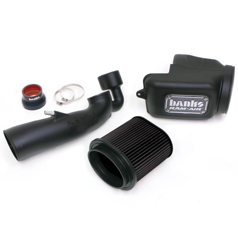 Banks Ram-Air Banks Power, an innovator in gas and diesel performance for over 60 years, introduces the latest in its Ram-Air family of emissions compliant performance cold air intakes. The new system gives the Jeep 3.6L Wrangler JL and Gladiator JT exceptional horsepower and reliability by providing the engine with increased air density, airflow and the best filtration available. The Ram-Air cold air intake adds a tested best-in-class airflow of 782 CFM, a gain of 82% over stock and 21.6% over its closest competitor. The system produces lower temperature air at higher pressure providing air density right at the throttle inlet. As a result, the Banks Ram-Air system boasts a 38% air density improvement compared to the stock intake, two times the increase of its closest competitor. This lower temperature air provides more thermal headroom before the engine hits the detonation limit of the fuel, resulting in more power on hot days. Its durable molded plastic housing is fully enclosed, keeping power-robbing hot air in the engine bay where it belongs and not in the intake system. At the heart of the Ram-Air system is Banks’ new Big-Ass Filter element which is the largest and least restrictive in its class. Like all Banks Ram-Air intakes, the system was designed using computational fluid dynamics, followed by rigorous testing on the flow bench, dynamometer and on-road driving. Available in both oiled and dry variations, Banks’ new Big-Ass filters offer 672 square inches of surface area, 21% more than their closest competitor. This allows for greater dirt collection and more miles between cleaning. The Ram-Air advantage becomes even more pronounced the dirtier the filter gets. Competitive filters clog up and become restrictive long before the Big-Ass Filter. Superior filtration is accomplished by using a proprietary multi-layer woven cloth that keeps even the finest dirt and debris out of the intake system while providing maximum airflow. +38% Mass Air Flow Gain. 82% Less restrictive than stock