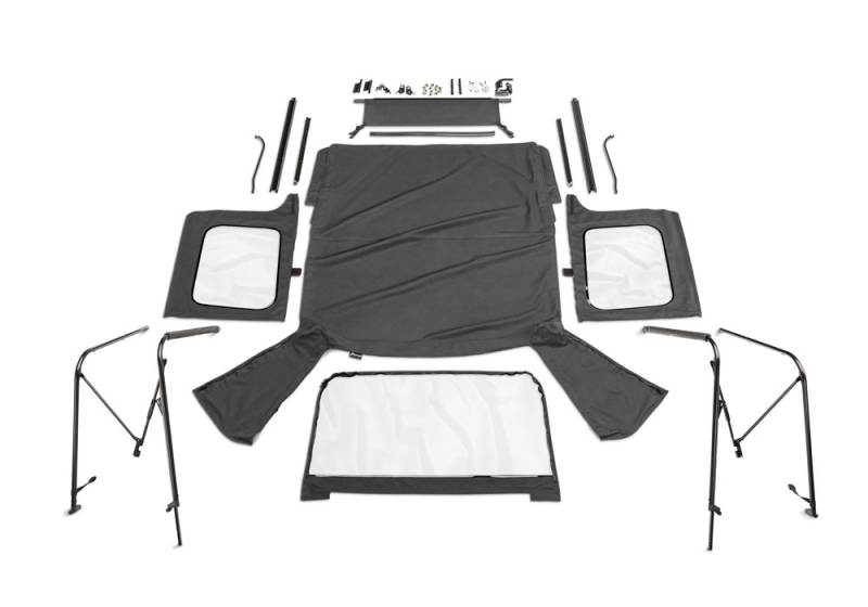 Complete Top, Frame & Hardware for Full Steel Doors The CJ7/YJ Complete Soft Top includes factory-grade fabric top, full frame, hardware, bows, soft top storage bag and tailgate tonneau. It comes with easy to follow instructions and is packaged in a convenient, durable canvas storage bag. Convenient Interior Storage Pockets Exclusive Upgrade Adjustable Spreader Bars Free Soft Top Storage Bag and Glove Box Organizer Two Year Warranty Includes Everything Fabric Top/Frame And Hardware