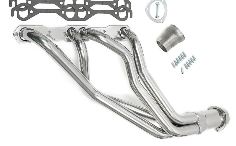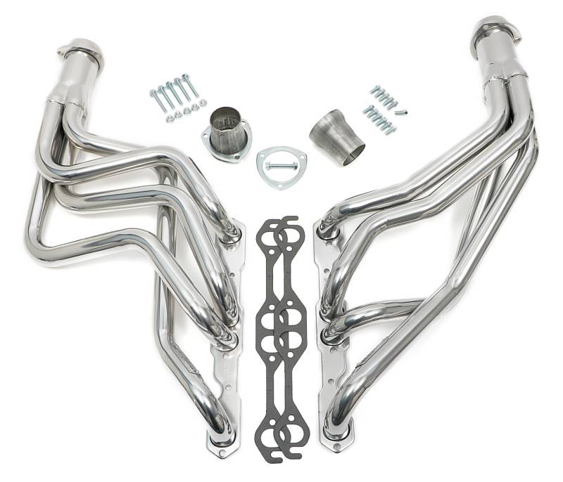 Silver Long-Tube Headers For 67-81 Camaro 283-400, Close Ratio PS Specially Designed To Provide Additional Clearance For Larger, Close-Ratio (Quick Ratio) Steering Boxes Mild Steel, Long Tube Header Design Provides Better Top-End Horsepower and Torque. Ball & Socket Collector Design requires No Gasket, and Allows For More Exhaust System Misalignment than Old School, Gasket-Style Header Collectors Includes All The Necessary Mounting Hardware, Gaskets and Reducers (exhaust adapters) Limted Lifetime Warranty On Construction, Five Year Warranty on Factory-Applied Header Coating!