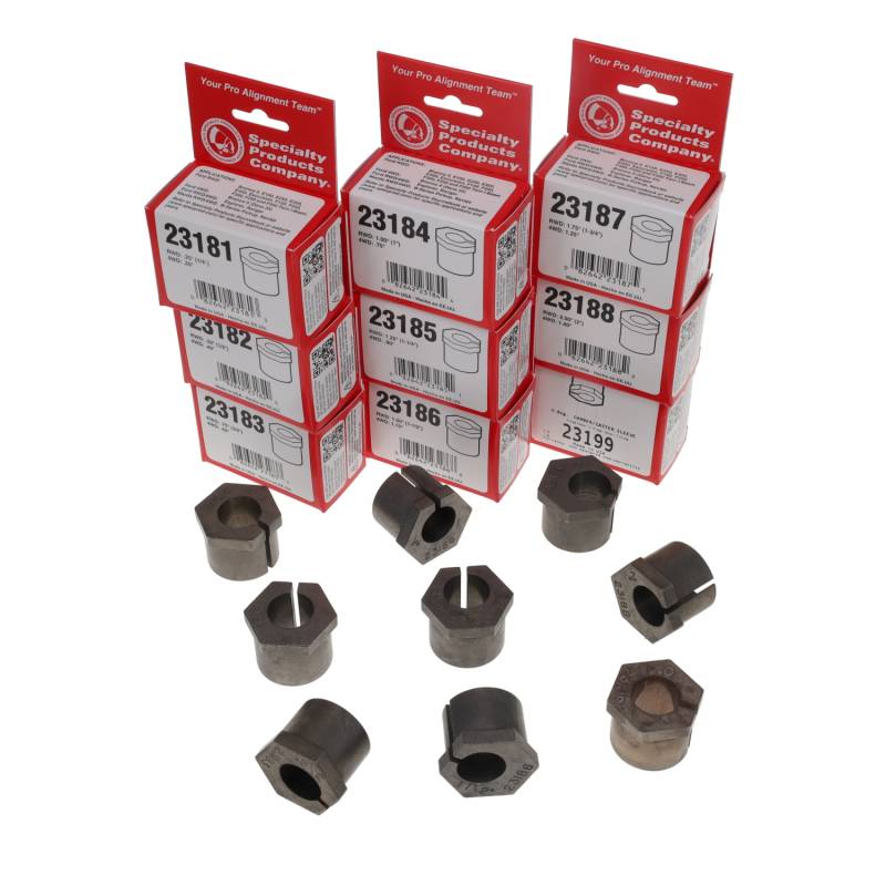 These popular sleeves are widely used to adjust caster and/ or camber on many Ford and Mazda RWD & 4WD trucks. To install, simply loosen and remove upper ball joint pinch bolt. Remove top snap ring if one is present. Use 77880 sleeve puller to remove the existing sleeve. To split camber and caster adjustment, rotate sleeve 45°. Save time during alignment, use 23199 zero-degree sleeve to determine initial readings, then install correct sleeve. Note: Sleeves adjust to a smaller degree on Ford and Mazda 4WD light trucks/SUVS. Set 23180 contains 1 each: 23181, 23182, 23183, 23184, 23185, 23186, 23187, 23188, 23199