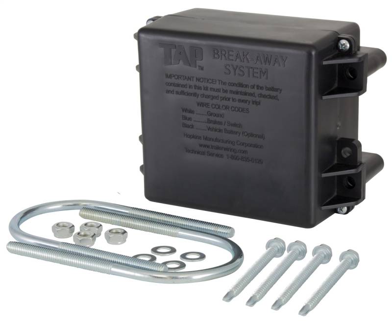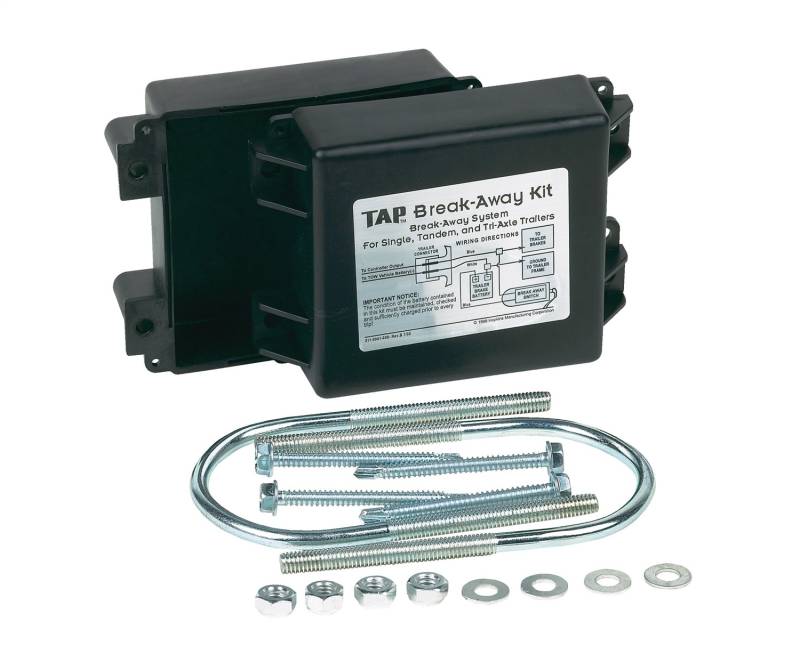 Make sure your break-away kit remains charged for proper operation! The battery charger will charge your trailer break-away battery when your vehicle is connected to the trailer. Break-away kits activate trailer brakes upon separation from tow vehicle. Most states and provinces require trailer break-away kit.