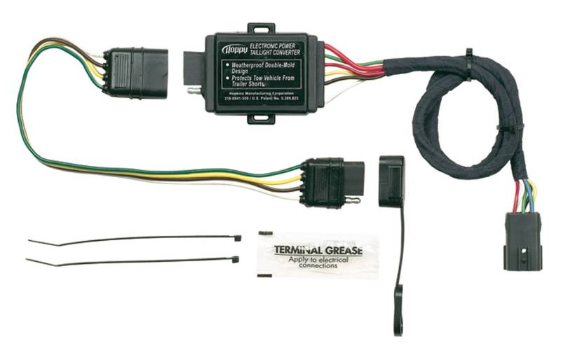 Dont splice onto your vehicles factory wiring harness. Simply plug in this Hopkins vehicle wiring kit featuring exact OEM matching connectors for a perfect weather-tight fit. This kit provides a power converter that reduces the load on the vehicles lights and provides brighter lights on the trailer. Required accessories are included to get you towing faster.