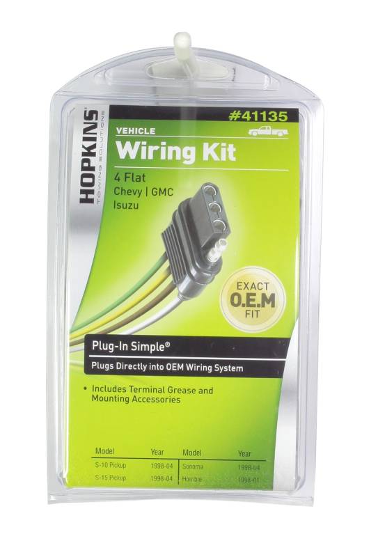 Dont splice onto your vehicles factory wiring harness. Simply plug in this Hopkins vehicle wiring kit featuring exact OEM matching connectors for a perfect weather-tight fit. This kit includes the accessories needed to get you towing faster.