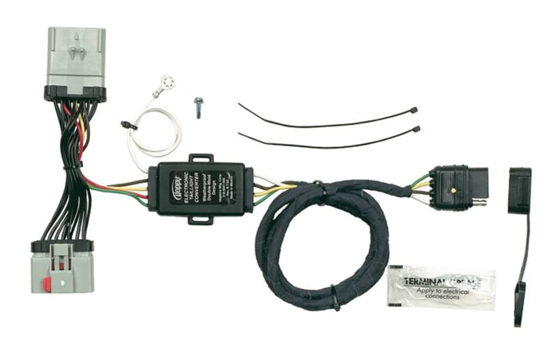 Dont splice onto your vehicles factory wiring harness. Simply plug in this Hopkins(R) vehicle wiring kit featuring exact OEM matching connectors for a perfect weather-tight fit. This kit provides a taillight converter that adapts the vehicles independent lights to the trailers common lights. Required accessories are included to get you towing faster.