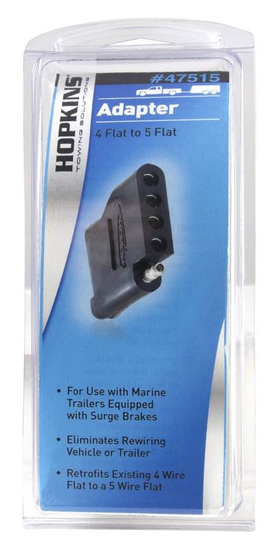 Some boat trailers have 5 Flat connectors on them to activate the surge brake. The 47515 4 Flat to 5 Flat adapter allows you to add the reverse wire to your existing 4 Flat that allows the surge brake to release.