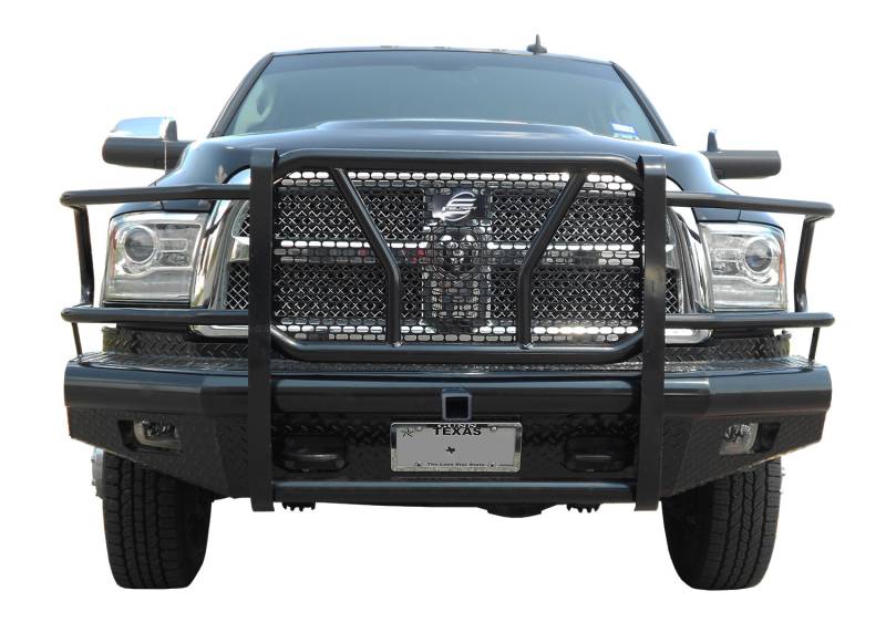 HD Front Bumper Replacements Diamond plate & schedule 40 pipe, 1 year warranty, convenient receiver, punch plate grille, semi-gloss finish and both E-coated and powder coated to ensure quality performance. Supports Front Emblem Cameras & Adaptive Cruise Control