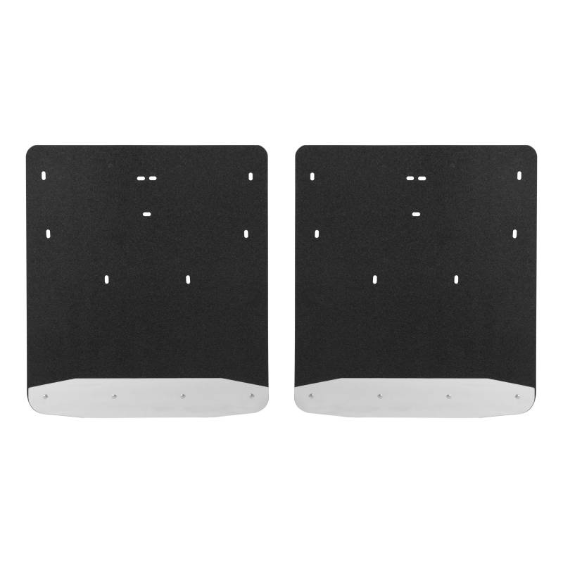 Rear Dually 20" x 23" Rubber Mud Guards, Select Ford F-350, F-450 (2 Flaps) Whether you're on the job or off-roading through the wilderness, it doesn't take long for rocks and other debris to wreak havoc on the body of your truck. LUVERNE Textured Rubber Mud Guards are the perfect solution for maintaining that pristine, professional look. For the front or rear of the truck, these custom mud flaps add style and body protection. They are constructed from heavy-duty black rubber that stands up to road debris and sheds water with ease. They feature 18-gauge stainless steel plates to help protect the bottom edge and extend the life of the mud flaps. With their 3/8" thick, recycled rubber construction, Textured Rubber Mud Guards easily deflect everything from mud to gravel, protecting the body of your truck from scratches, chips and scuffs. They are also made to add a stylish accent to your truck, featuring stainless steel plates along the bottom edge of each flap. The plates are made from 18-gauge stainless steel to provide a heavy-duty, rust-resistant shield, and they feature a bright, high-polish finish for a long-lasting shine. The textured finish of the rubber mud flaps is also designed to easily hide minor scuffs and scratches and maintain a clean appearance. For an easy installation and a custom fit, these truck mud flaps are made vehicle-specific. This particular set fits specific years of the Ford F350 Super Duty and F450 Super Duty (see application info to verify fitment). They install with corrosion-resistant fasteners and high-strength steel mounting brackets with a galvanized finish for long-lasting durability. Universal mud flaps are also available.
