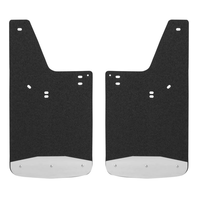 Front or Rear 12" x 23" Rubber Mud Guards, Select F-150, Mark LT (2 Flaps) Whether you're on the job or off-roading through the wilderness, it doesn't take long for rocks and other debris to wreak havoc on the body of your truck. LUVERNE Textured Rubber Mud Guards are the perfect solution for maintaining that pristine, professional look. For the front or rear of the truck, these custom mud flaps add style and body protection. They are constructed from heavy-duty black rubber that stands up to road debris and sheds water with ease. They feature 18-gauge stainless steel plates to help protect the bottom edge and extend the life of the mud flaps. With their 3/8" thick, recycled rubber construction, Textured Rubber Mud Guards easily deflect everything from mud to gravel, protecting the body of your truck from scratches, chips and scuffs. They are also made to add a stylish accent to your truck, featuring stainless steel plates along the bottom edge of each flap. The plates are made from 18-gauge stainless steel to provide a heavy-duty, rust-resistant shield, and they feature a bright, high-polish finish for a long-lasting shine. The textured finish of the rubber mud flaps is also designed to easily hide minor scuffs and scratches and maintain a clean appearance. For an easy installation and a custom fit, these truck mud flaps are made vehicle-specific. This particular set fits specific years of the Ford F150 and Lincoln Mark LT (see application info to verify fitment). They install with corrosion-resistant fasteners and high-strength steel mounting brackets with a galvanized finish for long-lasting durability. Universal mud flaps are also available.