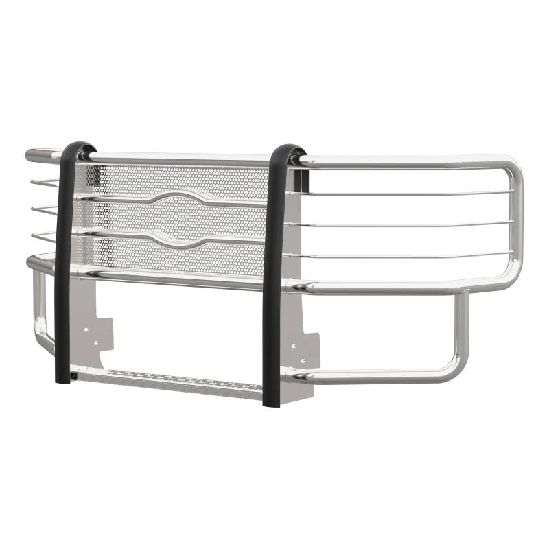Prowler Max Polished Stainless Grille Guard, Select Ford F-250, F-350 Super Duty Basic. Standard. Stock. Some words were never intended to describe your truck, and it takes a certain type of hardworking truck accessory to meet your expectations. The LUVERNE Prowler Max grille guard equips your truck to tackle the toughest of jobs with its uncommon construction, comprehensive protection and arsenal of extra features. It begins with a bold, punched steel screen center section. This heavy-gauge mesh not only adds style to the Prowler Max but also increases protection for your grille, shielding it from rocks, debris and other threats. The center section features our signature logo reveal with contoured horizontal tubes to add even more protection and increase structural stability. Below the center section is a built-in 4" wide step with non-skid, diamond treads. The step blends perfectly with the grille guard and provides easier access when working under the hood, particularly on large, full-size pickup trucks. The Prowler Max grille guard also distinguishes itself with its vehicle-specific wraparound ring assembly. The double-stacked side brush guards uniquely contour to the front end of each truck application and feature 3/8" wires for increased headlight protection. This particular custom truck grille guard fits specific years of the Ford F250 Super Duty and F350 Super Duty (see fitment info to verify). To give it the muscle to stand behind its attitude, we construct the Prowler Max from one-piece, 2" diameter tubular steel. Its heavy-duty uprights bolt directly to the frame of the truck, using high-strength steel brackets and a no-drill installation (NOTE: Brackets for attaching this grille guard are included but shipped separately). To finish things off, the Prowler Max truck grille guard is available in two finish options. The E-coat and black powder coat finish offers maximum durability, while the high-polish stainless steel provides a bright, no-rust shine.