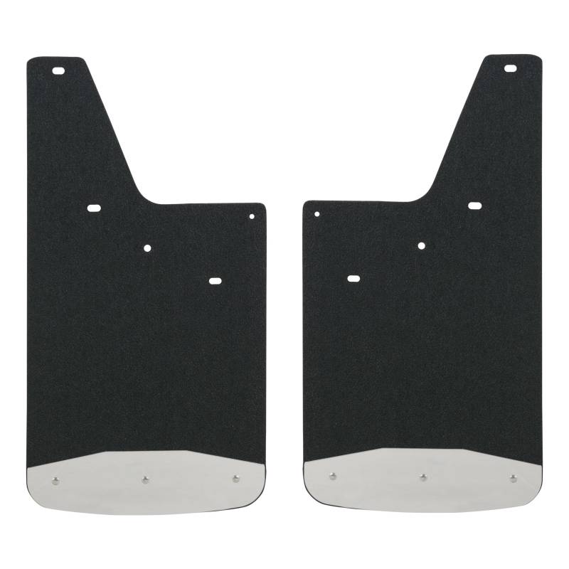 Front or Rear 12" x 23" Rubber Mud Guards, Select Silverado, Sierra (2 Flaps) Whether you're on the job or off-roading through the wilderness, it doesn't take long for rocks and other debris to wreak havoc on the body of your truck. LUVERNE Textured Rubber Mud Guards are the perfect solution for maintaining that pristine, professional look. For the front or rear of the truck, these custom mud flaps add style and body protection. They are constructed from heavy-duty black rubber that stands up to road debris and sheds water with ease. They feature 18-gauge stainless steel plates to help protect the bottom edge and extend the life of the mud flaps. With their 3/8" thick, recycled rubber construction, Textured Rubber Mud Guards easily deflect everything from mud to gravel, protecting the body of your truck from scratches, chips and scuffs. They are also made to add a stylish accent to your truck, featuring stainless steel plates along the bottom edge of each flap. The plates are made from 18-gauge stainless steel to provide a heavy-duty, rust-resistant shield, and they feature a bright, high-polish finish for a long-lasting shine. The textured finish of the rubber mud flaps is also designed to easily hide minor scuffs and scratches and maintain a clean appearance. For an easy installation and a custom fit, these truck mud flaps are made vehicle-specific. This particular set fits specific years of the Chevy Silverado 1500, 2500 HD or 3500 HD and GMC Sierra 1500, 2500 HD or 3500 HD (see application info to verify fitment). They install with corrosion-resistant fasteners and high-strength steel mounting brackets with a galvanized finish for long-lasting durability. Universal mud flaps are also available.