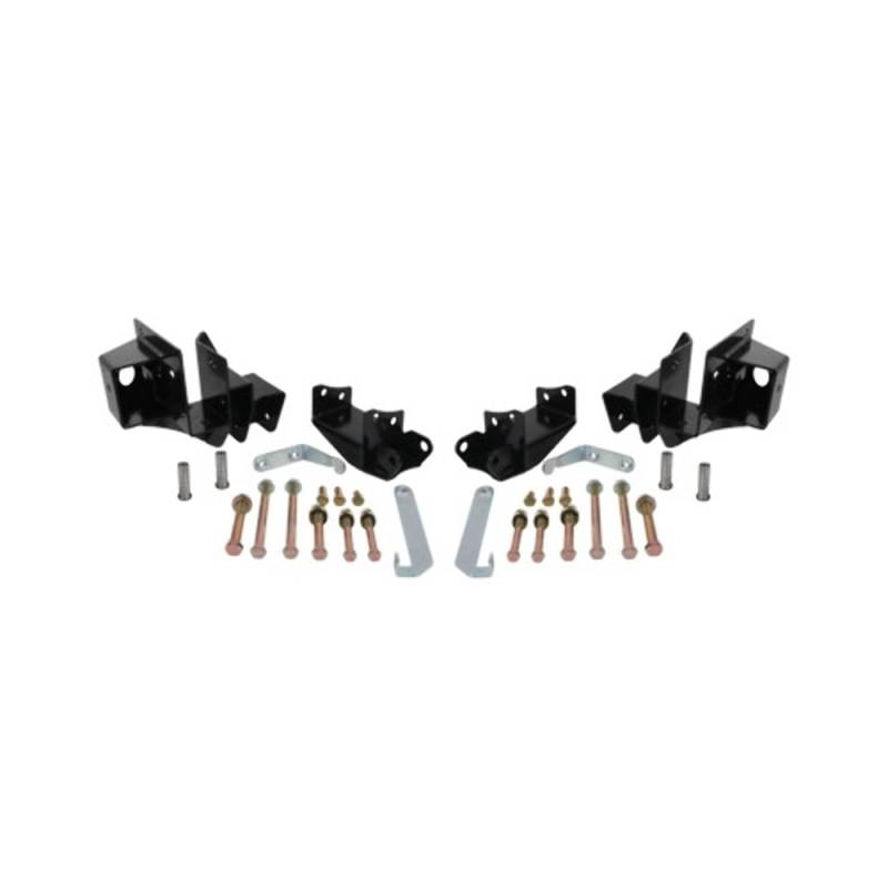 Front long arm brackets are designed to optimize ground clearance and engineered to provide maximum articulation and improved vehicle dynamics. Integrated removable skidplate assemblies protect control arm joints and allow for easy removal of factory transmission crossmember. Designed to be used in conjunction with 8585 Dodge 03-12 Front High Clearance Upper Long Arm and 8583 Dodge 03-12 Front High Clearance Lower Long Arm.
