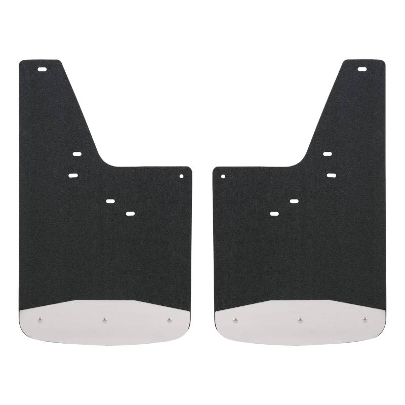 Front or Rear 12" x 20" Rubber Mud Guards, Select Silverado, Sierra (2 Flaps) Whether you're on the job or off-roading through the wilderness, it doesn't take long for rocks and other debris to wreak havoc on the body of your truck. LUVERNE Textured Rubber Mud Guards are the perfect solution for maintaining that pristine, professional look. For the front or rear of the truck, these custom mud flaps add style and body protection. They are constructed from heavy-duty black rubber that stands up to road debris and sheds water with ease. They feature 18-gauge stainless steel plates to help protect the bottom edge and extend the life of the mud flaps. With their 3/8" thick, recycled rubber construction, Textured Rubber Mud Guards easily deflect everything from mud to gravel, protecting the body of your truck from scratches, chips and scuffs. They are also made to add a stylish accent to your truck, featuring stainless steel plates along the bottom edge of each flap. The plates are made from 18-gauge stainless steel to provide a heavy-duty, rust-resistant shield, and they feature a bright, high-polish finish for a long-lasting shine. The textured finish of the rubber mud flaps is also designed to easily hide minor scuffs and scratches and maintain a clean appearance. For an easy installation and a custom fit, these truck mud flaps are made vehicle-specific. This particular set fits specific years of the Chevy Silverado 1500, 2500 HD or 3500 HD and GMC Sierra 1500, 2500 HD or 3500 HD (see application info to verify fitment). They install with corrosion-resistant fasteners and high-strength steel mounting brackets with a galvanized finish for long-lasting durability. Universal mud flaps are also available.