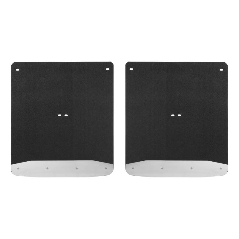 Rear Dually 20" x 23" Rubber Mud Guards, Select Silverado, Sierra 3500 (2 Flaps) Whether you're on the job or off-roading through the wilderness, it doesn't take long for rocks and other debris to wreak havoc on the body of your truck. LUVERNE Textured Rubber Mud Guards are the perfect solution for maintaining that pristine, professional look. For the front or rear of the truck, these custom mud flaps add style and body protection. They are constructed from heavy-duty black rubber that stands up to road debris and sheds water with ease. They feature 18-gauge stainless steel plates to help protect the bottom edge and extend the life of the mud flaps. With their 3/8" thick, recycled rubber construction, Textured Rubber Mud Guards easily deflect everything from mud to gravel, protecting the body of your truck from scratches, chips and scuffs. They are also made to add a stylish accent to your truck, featuring stainless steel plates along the bottom edge of each flap. The plates are made from 18-gauge stainless steel to provide a heavy-duty, rust-resistant shield, and they feature a bright, high-polish finish for a long-lasting shine. The textured finish of the rubber mud flaps is also designed to easily hide minor scuffs and scratches and maintain a clean appearance. For an easy installation and a custom fit, these truck mud flaps are made vehicle-specific. This particular set fits specific years of the Chevy Silverado 3500 HD and GMC Sierra 3500 HD (see application info to verify fitment). They install with corrosion-resistant fasteners and high-strength steel mounting brackets with a galvanized finish for long-lasting durability. Universal mud flaps are also available.