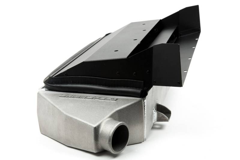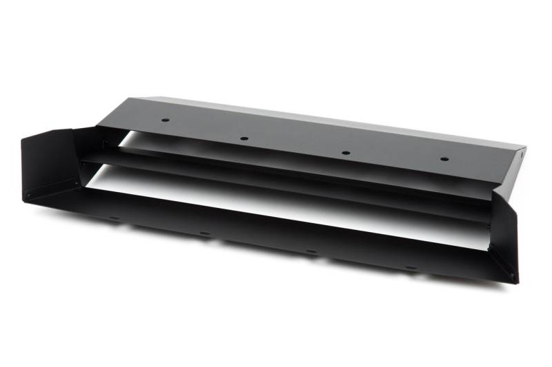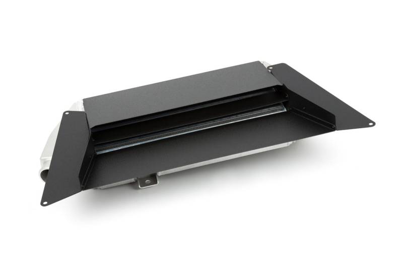 Each intercooler uses two unique end tanks. The first accepts the hot charge air from the turbo and feeds it to the intercooler core. The second receives the cooled charge air from the core and delivers it to the throttle body. These end tanks are precision cast and machined right here in Minnesota. The bypass valve flange is milled flat and stainless steel studs are permanently installed to ensure that the aluminum threads don’t become damaged and shorten the life of the intercooler. Following inspection, end tanks are welded to high density bar and plate intercoolers before the entire assembly is pressure tested, cleaned and sealed for shipment. 5-ply silicone couplers hold their shape in extreme conditions and ensure that charge air makes it to and from the intercooler with no trouble. Splitters are laser cut from aluminum sheet and CNC bent before being assembled and powdercoated with a durable texture black finish. Stainless steel hardware secures the splitter to the factory hood scoop.