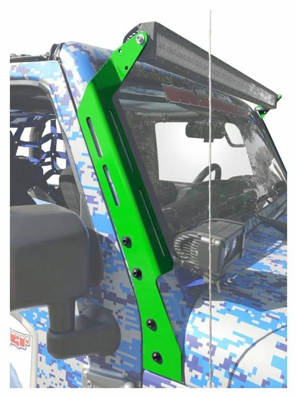 The Steinjager A-Pillar brackets are designed to use the four outside factory windshield bolts on each side. The design allows for body color to show through to accent the powdercoat color of your choice. The brackets were designed to fit the standard 50 inch light bar of your choice. They also have holes in them to accept the Steinjager Limb Lifter Add On. LIGHTS NOT INCLUDED