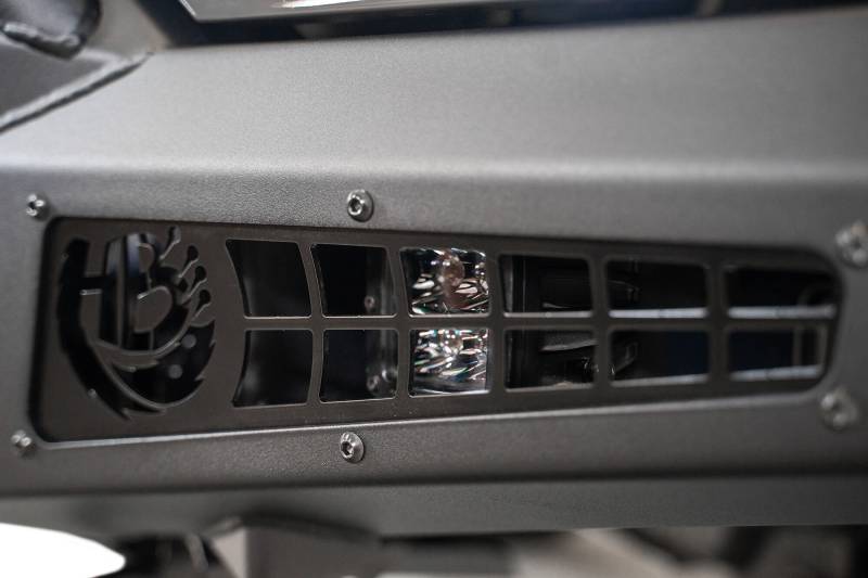 HoneyBadger Front Bumper The newly redesigned Addictive Desert Designs HoneyBadger Front Bumper keeps the same rugged styling as the original but with a low-profile fitment. There is an optional top hoop, but either configuration has room to mount a radius 30" light bar on top of the bumper. The center of the bumper houses a straight 20" light bar, and two cube lights can be mounted behind the side panels. The HoneyBadger comes in hammer black powder coat with satin black panels. OEM amenities, such as parking sensors and tow hooks, are retained. Even though it is an aftermarket front bumper, the HoneyBadger follows the bodylines perfectly, making the front of your F-150 look unique without sacrificing quality. As always this product is fully bolt-on and made in America.