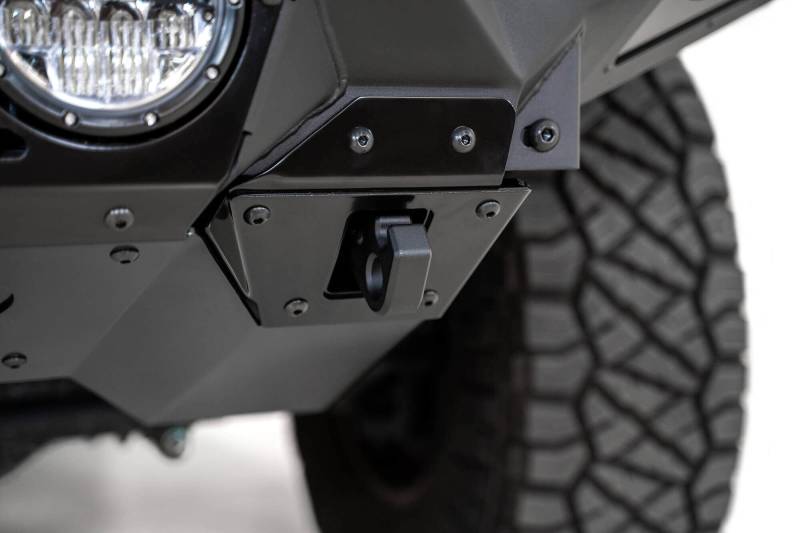 Bomber Front Bumper The Addictive Desert Designs Bomber Front Bumper is the slimmest fitting design for your 2020 Ram 2500. A modern plate steel design gives a clean look, while the full 3/16" aluminum skid plate saves on weight. Reinforced mounts for 3/4" D-Rings bolt straight to your frame for unrivaled strength. Three different lighting options are available: 4 Rigid 360 6" light mounts, 3 Baja Designs LP6 light mounts, or two 20" light bar mounts. Each bumper comes with two additional cube light mounts behind the side panels. As always, this bumper is fully bolt-on and made in America.